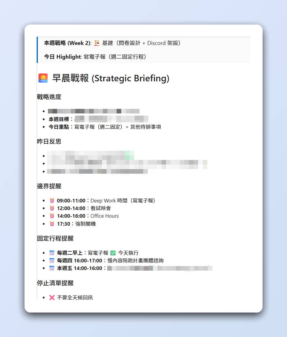 - 進入雷射模式(Laser):專注於這個重點,避免分心。書裡提到很多方法,像是關掉通知、設定時間區塊等等,幫助你真正進入深度工作狀態。